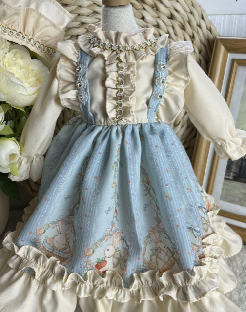 Featuring delicate bunny motifs and soft pastel shades, this outfit includes only the dress and headpiece (doll not included).