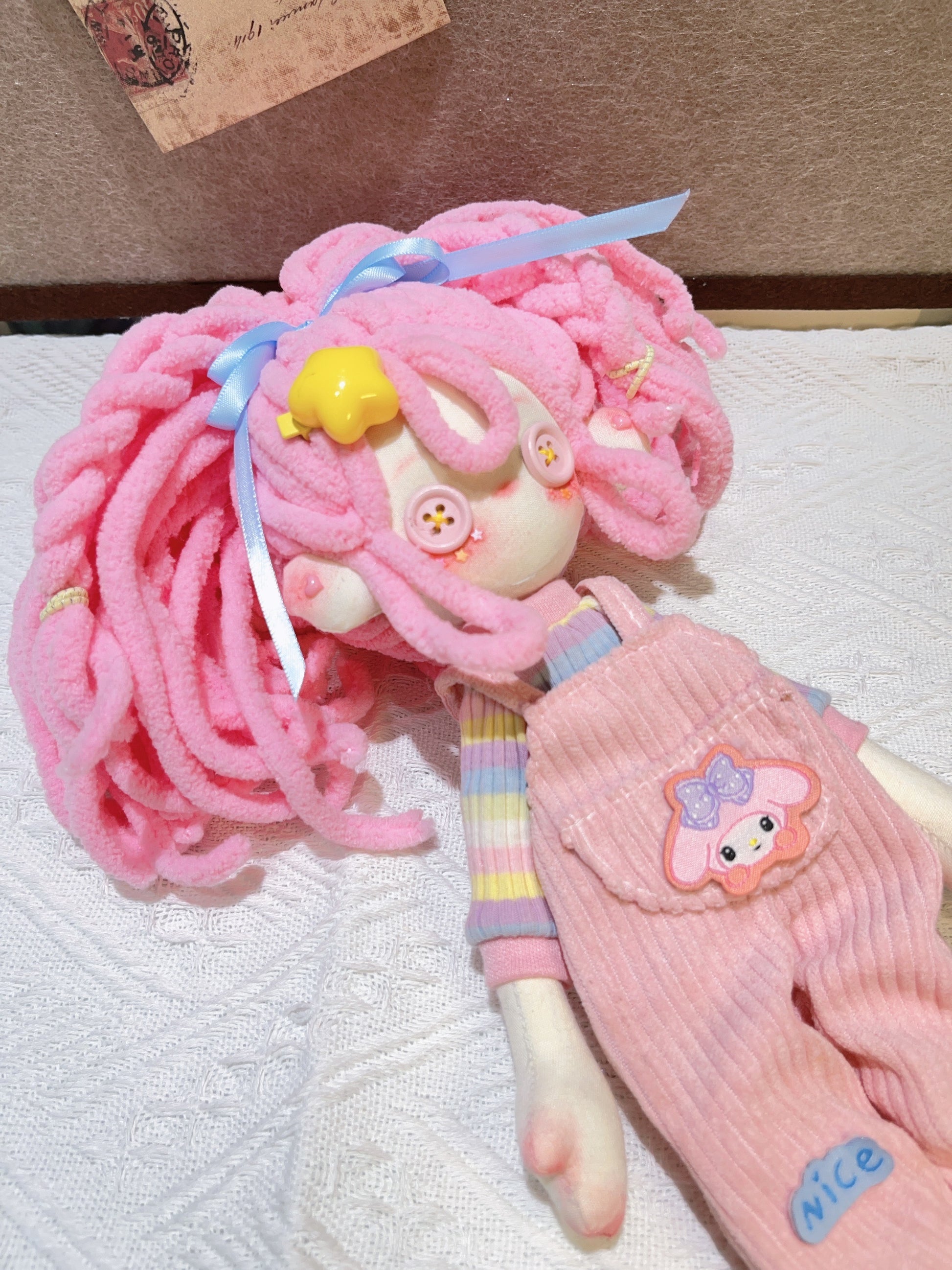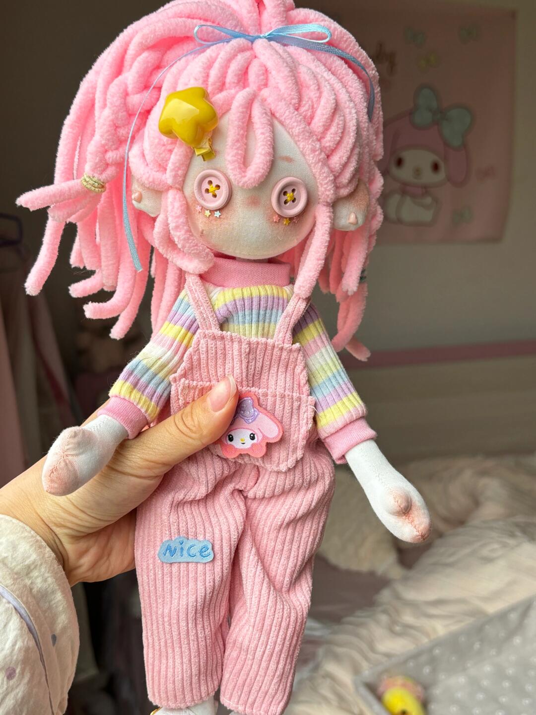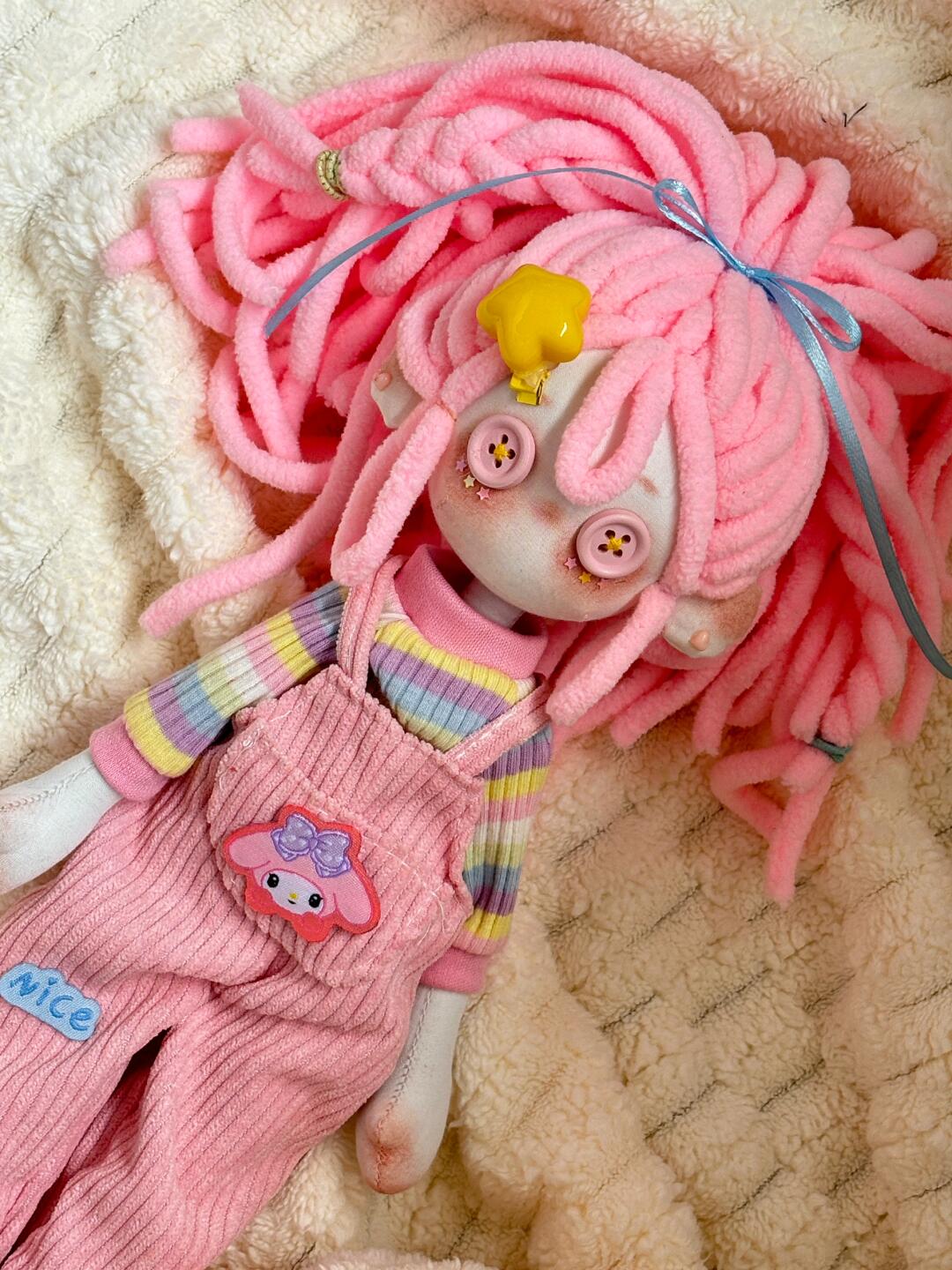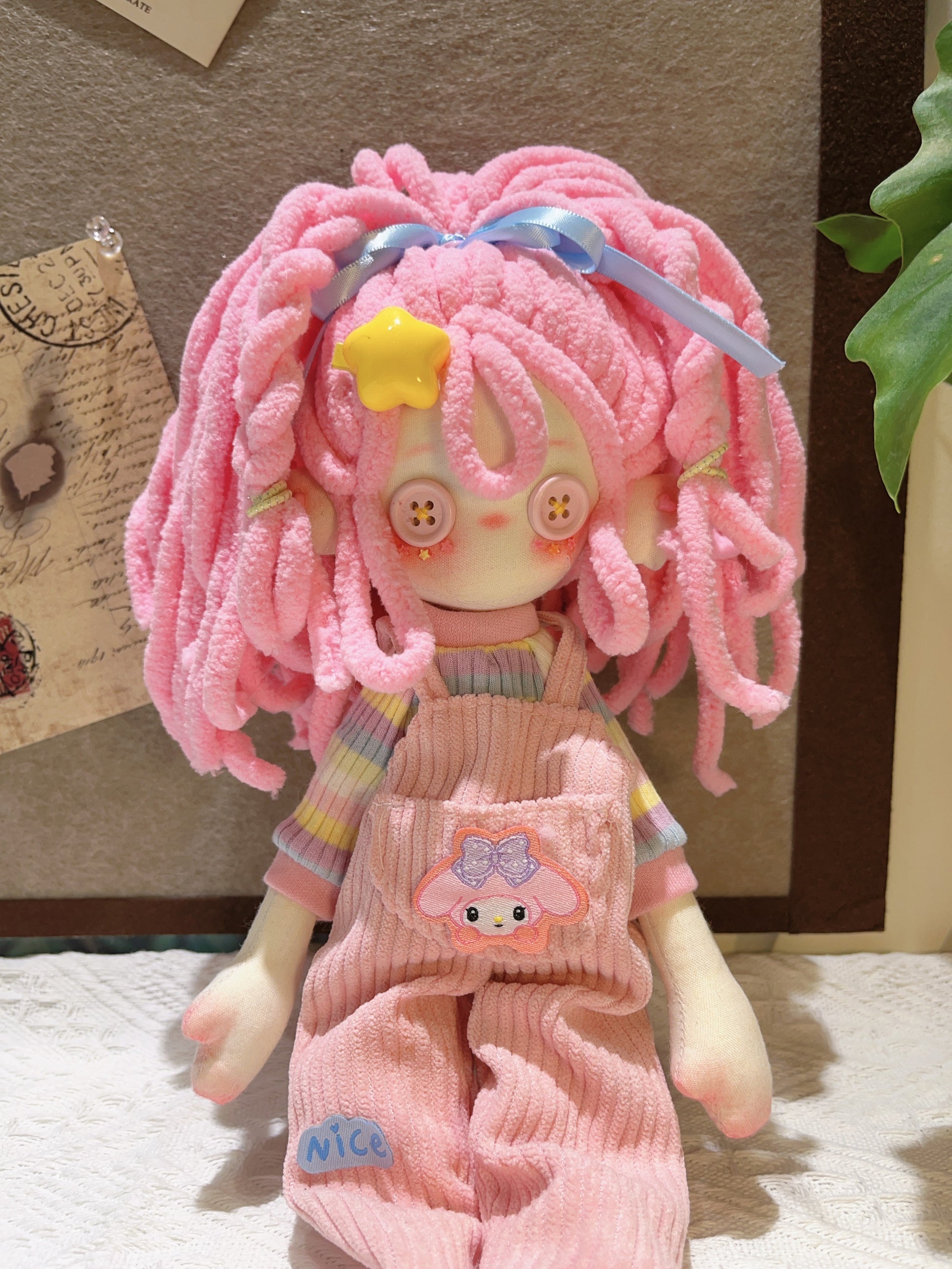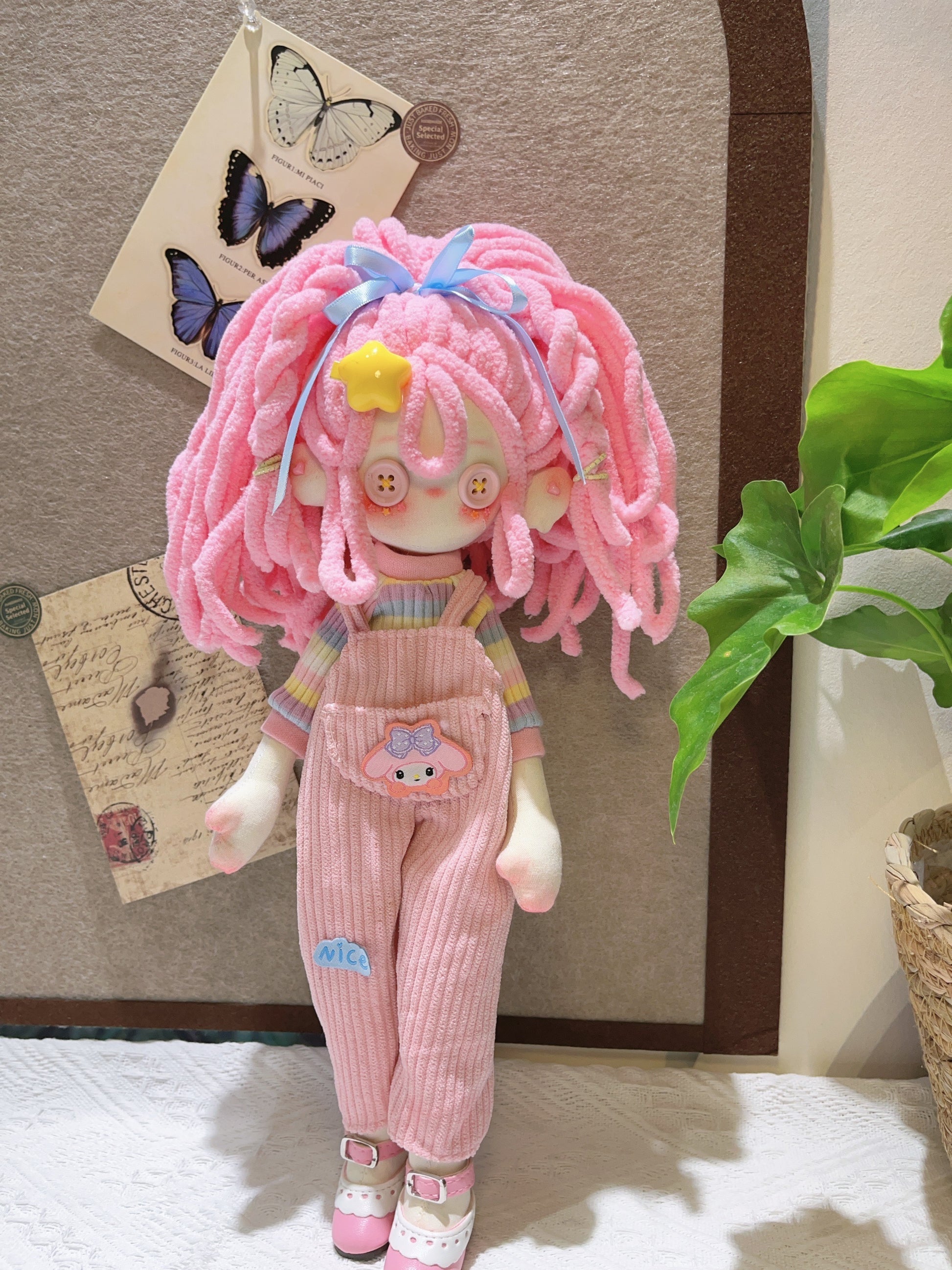 Meet Bubblegum Dream! With her bright pink hair, sweet button eyes, and the cutest overalls, she’s a pastel lover’s dream come true. Handmade with love and full of charm, she’s here to bring a pop of color and happiness to your day.