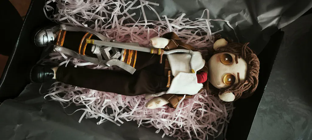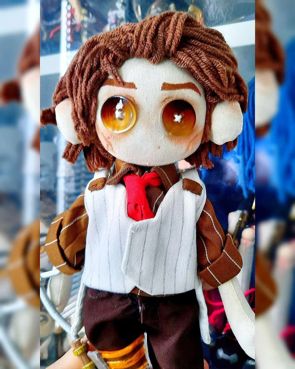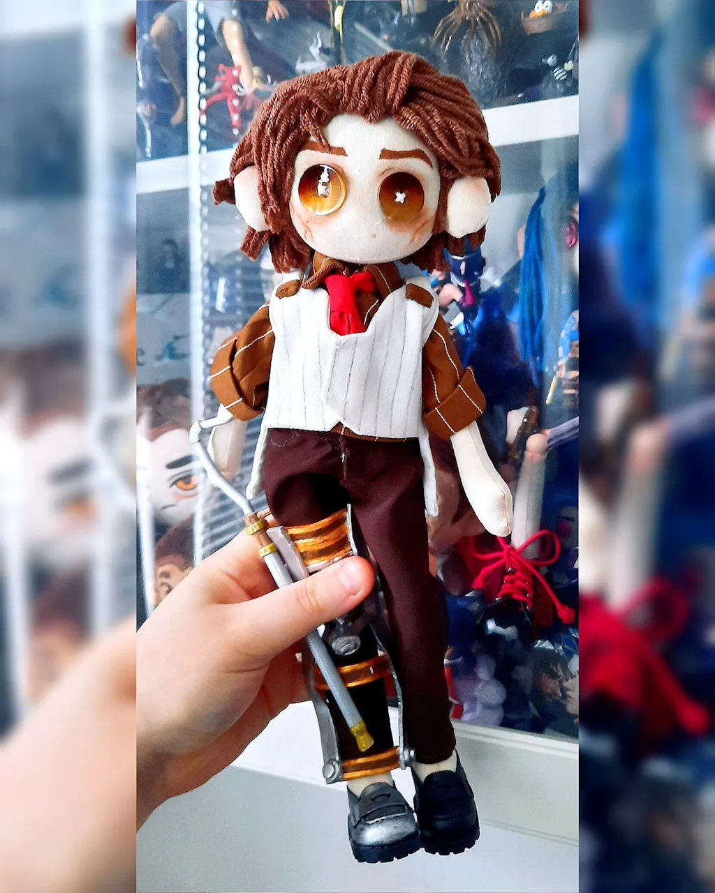 Introducing our handmade Viktor button-eye doll, quiet brilliance wrapped in soft stitches. With warm golden-brown tones, thoughtful button eyes, and his signature cloak and mechanical leg detail, this tiny Viktor carries the heart of a dreamer and the mind of a genius.